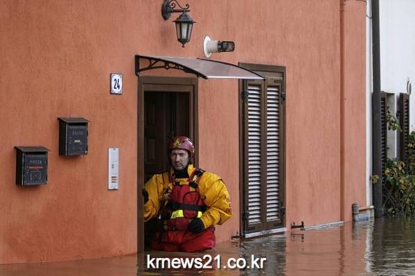 이탈리아 북서부에 며칠째 집중호우가 내리면서 이탈리아에서 가장 큰 강인 포 강이 범람하고 아스티, 쿠네오 등 피에몬테 주(州) 주요 도시가 물에 잠겼다. 쿠네오와 토리노 일대에서는 약 400명의 주민이 대피했다. 사진은 이탈리아 소방관이 토리노 인근 몬칼리에리의 침수된 마을에서 시민들을 대피 시키는 작업중인 모습.