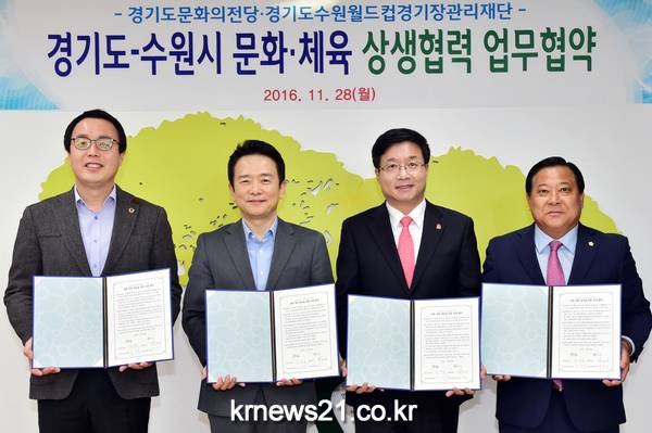 수원시와 경기도는 28일 수원 팔달구 경기도청 도지사 집무실에서 염태영 수원시장, 남경필 경기도지사, 정기열 경기도의회 의장, 김진관 수원시의회 의장 등이 참석한 가운데 ‘수원시·경기도 문화체육 발전을 위한 상생협약’을 체결하고 이관을 약속했다.