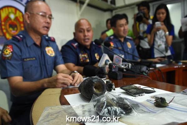 ▲ 필리핀 마닐라 주재 미국 대사관 인근에서 28일 사제폭탄이 발견되 경찰 해체 작업을 벌였다. 로날드 델라 로사 필리핀 경찰청장이 해체된 사제폭탄을 공개하고 있다. Ted ALJIBE / AFP[제공자ⓒ 뉴스21통신. 무단전재-재배포 금지.]필리핀 마닐라 주재 미국 대사관 인근 쓰레기통에서 폭탄이 발견되 이를 해체 했다고 관계당국이 밝혔다. 당국자들은 IS가 시도한 테러 행위로 보고 이를 비난하고 있다.