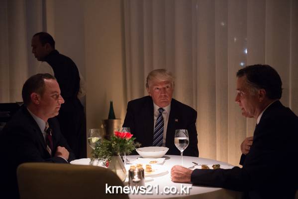 ▲ 도널드 트럼프 미국 대통령 당선인(가운데)은 29일(현지시간) 뉴욕의 트럼프 인터내셔널 호텔 앤 타워에 있는 장 죠르지 레스토랑에서 차기 정부 국무장관 강력 후보자인 밋 롬니 전 매사추세츠 주지사(오른쪽)와 백악관 비서실장 내정자인 라인스 프리버스 공화당전국위원회(RNC) 위원장과 저녁 만찬을 가졌다. BRYAN R. SMITH / AFP[제공자ⓒ 뉴스21통신. 무단전재-재배포 금지.]도널드 트럼프 미국 대통령 당선인이 29일(현지시간) 밋 롬니 전 매사추세츠 주지사와 저녁 만찬 자리를 가졌다.