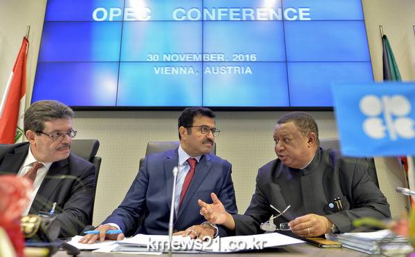 ▲ HERBERT NEUBAUER / APA / AFP[제공자ⓒ 뉴스21통신. 무단전재-재배포 금지.]석유수출국기구(OPEC)가 30일(현지시간) 지난 2008년 이래 처음으로 국가별 감산 쿼터에 최종 합의하면서 현재 생산의 4.5%에 해당하는 120만 배럴을 감축하게 됐다.
