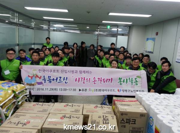이번 행사는 한국야쿠르트의 신입직원 35명이 참여하여 노인돌봄기본서비스사업 대상자인 홀몸어르신 20여분에게 300만원 상당의 후원물품 전달과 월동준비를 위한 봉사활동을 펼쳤다.