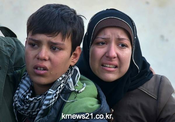 알레포 동부 반군 지역에서 정부군의 공세가 이어지는 가운데 폭력 사태를 겪은 시리아 주민들이 정부군이 장악한 바브 알 하디드 지역을 통해 살던 마을을 빠져나오면서 눈물을 흘리고 있다.