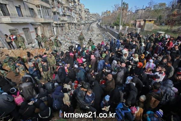 시리아 알레포 메이야무리 지역의 검문소에서 정부군에 의해 모여있는 주민들