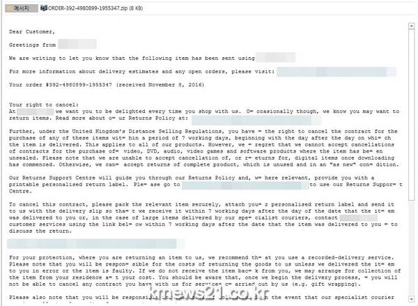 공격자는 유명 온라인 쇼핑몰을 사칭한 가짜 물품배송 안내메일에 악성 압축파일(.zip)을 첨부해 불특정 다수에게 유포했다. 메일 본문에는 물품 발송 및 반품, 교환에 대한 내용까지 상세하게 쓰여있어 사용자가 의심없이 메일 내 첨부파일을 클릭하기 쉽다.