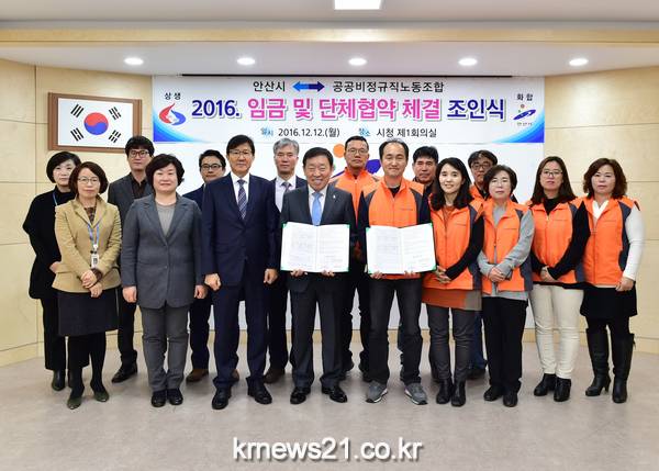 안산시(시장 제종길)와 공공비정규직노동조합(위원장 이성일)은 지난 12월 12일 시청 제1회의실에서 2016 임금 및 단체협약을 체결하고 조인식을 가졌다.