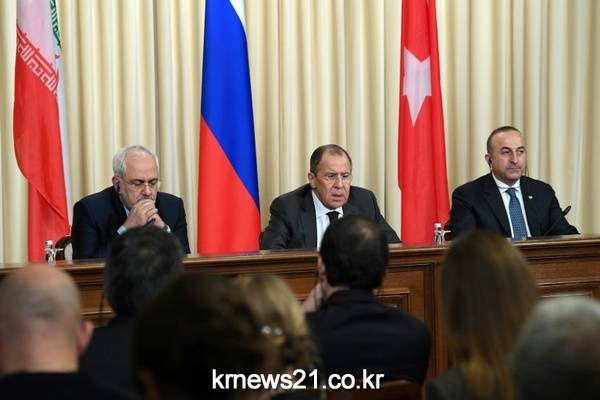 ▲ (왼쪽에서 오른쪽순)모하마드 자바드 자리프 이란 외무장관, 세르게이 라브로프 러시아 외무장관 그리고 메블뤼트 차우쇼을루 터키 외무장관이 20일(현지시간) 모스크바에서 공동 기자회견을 하고 있다. Natalia KOLESNIKOVA / AFP[제공자ⓒ 뉴스21통신. 무단전재-재배포 금지.]러시아와 이란, 터키 외무장관이 20일(현지시간) 모스크바에서 회담을 하고 시리아 사태 중재를 추진하기로 합의했다.