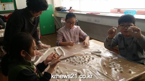 20일 봉산초등학교 5학년 4반 학생들이 빚어 만든 새알로 다음 날 적십자봉사회원들이 동지죽을 끓인 것.