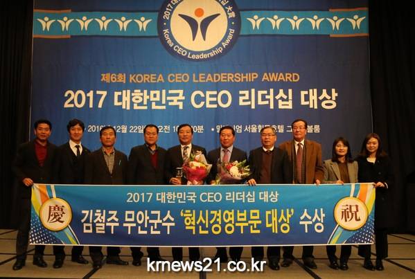 김철주 무안군수가 월간중앙이 주관하고 산업통상자원부‧중앙일보‧jtbc에서 후원하는 ‘2017 대한민국 CEO 리더십’대상에서 혁신경영 부문 대상을 수상했다.