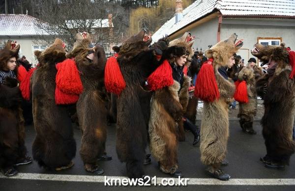 ▲ AFP / DANIEL MIHAILESCU[제공자ⓒ 뉴스21통신. 무단전재-재배포 금지.]루마니아 코마네스티 거리에서 신년맞이 전통춤 의식에 참가하기 위해 곰가죽을 쓴 소년들