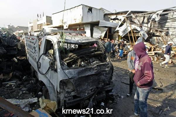 이라크 바그다드 청과물 시장에서 지난 8일(현지시간) 자살 폭탄 공격이 발생한 현장. 이날 공격으로 12명이 사망했다.