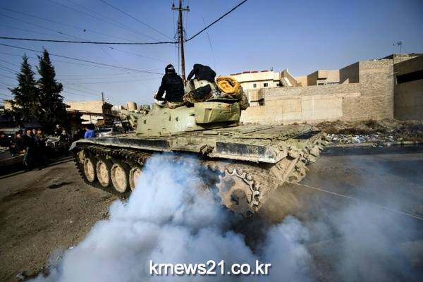 ▲ AFP / Dimitar DILKOFF[제공자ⓒ 뉴스21통신. 무단전재-재배포 금지.]이라크 군의 T-72 탱크가 티그리스 강 제4 다리 부근의 IS 군과의 전투 도중 모술의 동부와 서부를 연결하는 최전방으로 향하고 있다.
