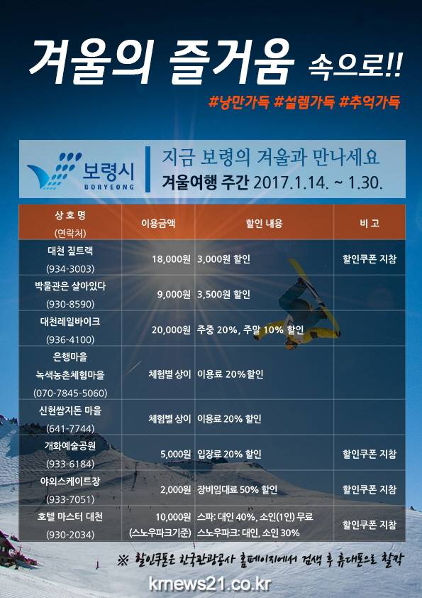 겨울 여행주간 관광지별 할인 혜택의 경우 한국관광공사 홈페이지(http://winter.visitkorea.or.kr/)를
