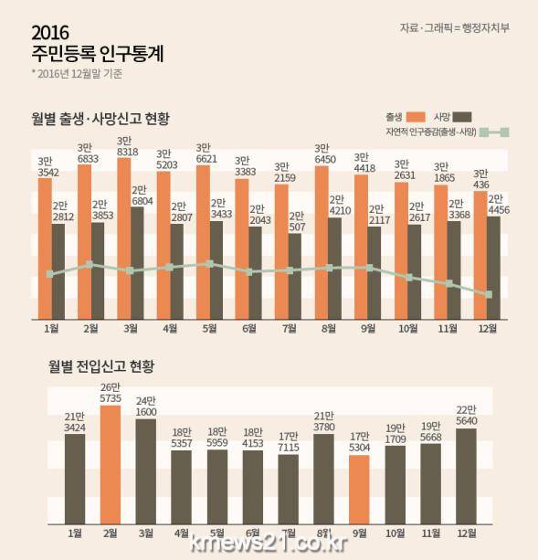 2016년 한 해 동안 전국 출생신고는 41만 1859명, 사망신고는 27만 9027명이었다. 자연적 인구 변동에 따른 증가는 13만 2832명으로 나타났다.
