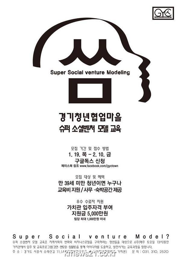시흥시(시장 김윤식) 경기청년협업마을은 청년들이 창업·창작 등 다양한 활동계획을 수립할 때 사회적 이슈·공공성·지역문제해결 차원에서 방안을 모색할 수 있도록 지원하는 슈퍼 소셜 벤처모델(SSM) 교육의 참여자를 19일부터 다음달 10일까지 모집한다.
