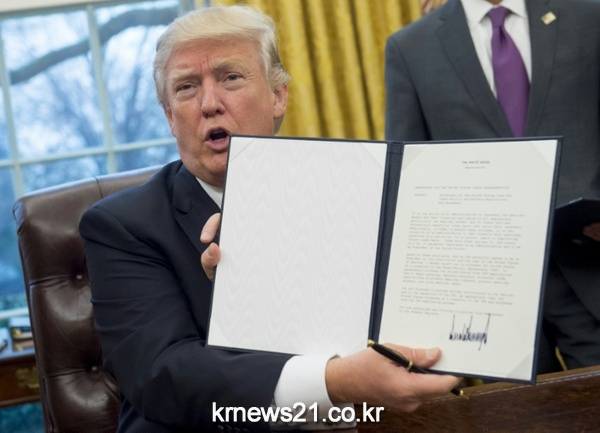 ▲ 환태평양경제동반자협정(TPP) 탈퇴를 위한 행정명령에 서명한 도널드 트럼프 대통령. AFP/ Soul Loeb[제공자ⓒ 뉴스21통신. 무단전재-재배포 금지.]도널드 트럼프 미국 대통령은 선거 캠페인 공약으로 내세웠던 환태평양경제동반자협정(TPP) 탈퇴를 위해 행정명령에 서명했다.