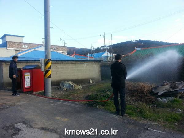 ▲ 농촌마을에 설치된 호스릴 소화전 화재진압 시범장면