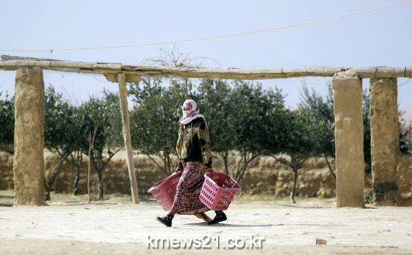 한 시리아 여성이 더 안전한 지역으로 옮겨가기 위해 집을 비우면서 플라스틱 바구니를