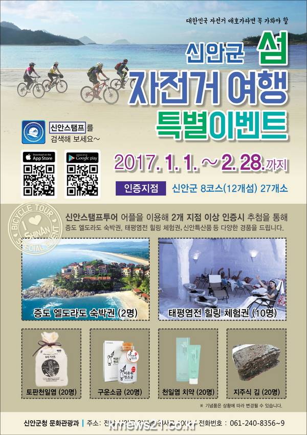 이벤트는 올해 1~2월 중 전용 어플을 이용해 자전거 인증 지점 두 개소 이상을 방문하면 추첨을 통해 엘도라도 숙박권, 태평염전 체험권, 천일염 등 다양한 특산품을 제공한다.