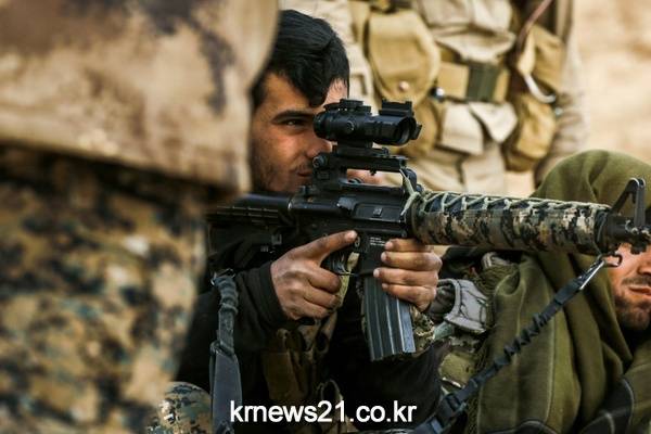 시리아 민주군(Syrian Democratic Forcer·SDF) 대원들이 IS 거점인 락까에서 북쪽으로 20km 떨어진 비르 파와즈 마을 근처에 자리잡고 있다.