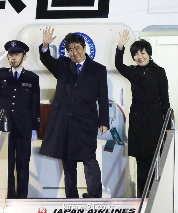 ▲ 아베 신조(왼쪽) 일본 총리와 아내 아키에 여사가 9일 하네다 공항에서 미국과의 정상회담을 위해 워싱턴으로 향하는 전용기에 탑승하기 전 손을 흔들며 인사하고 있다. STR / JIJI PRESS / AFP[제공자ⓒ 뉴스21통신. 무단전재-재배포 금지.]아베 신조 일본 총리가 도널드 트럼프 미국 대통령에 대한 막대한 투자 자금을 확보해 9일 저녁 워싱턴으로 향했다.