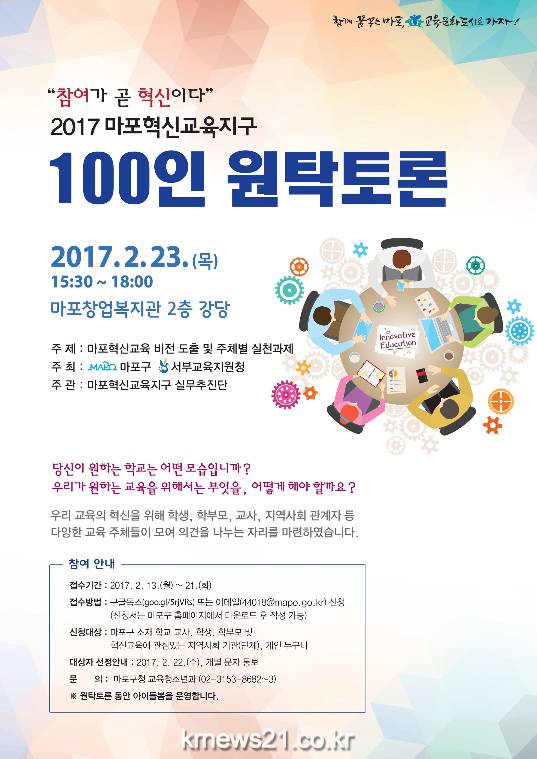 ‘2017 마포혁신교육지구 100인 원탁토론회’와 관련 기타 사항은 마포구 교육청소년과 ☏02-3153-8682, 8683 으로 문의하면 자세하게 안내 받을 수 있다.