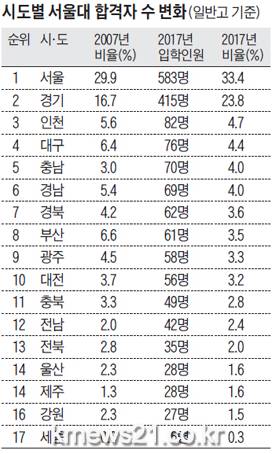 분석 결과에 따르면, 일반고 출신 서울대 합격자 가운데 서울 고교 출신은 2007년 29.9%에서 2017년 33.4%로, 경기도가 16.7%에서 23.8%로 각각 늘어났다. 반면 인천은 5.6%→4.7%로 줄었다.