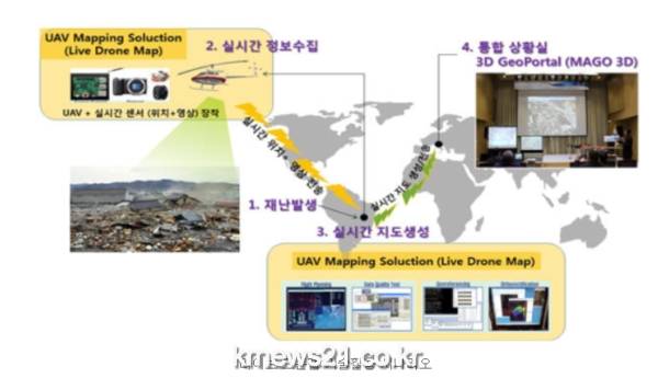 고정밀 위치센서를 부착한 드론이 지정경로를 따라 자동 비행(약 5km)하면서 촬영한 영상과 센서 정보를 전송하면, '드론 기반 자동지도구축 통합 소프트웨어(SW)'가 정보를 보정해 공간정보를 생성한다. 이렇게 생성된 공간정보를 3차원(3D)으로 가시화해 사용자가 지역상황을 실시간으로 파악할 수 있는 것이다.