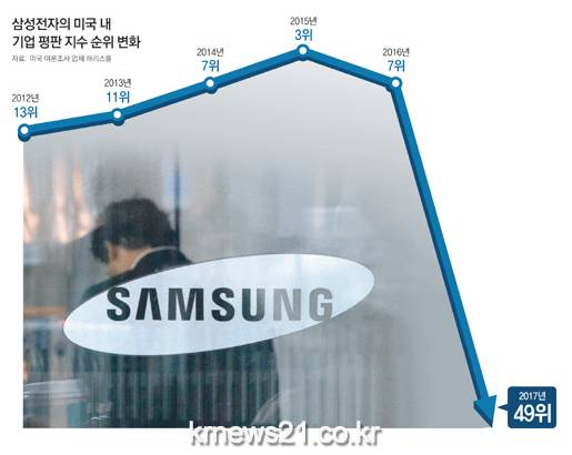 앞으로 이재용 삼성전자 부회장의 구속 사태까지 반영되면 삼성의 글로벌 이미지 추락은 가속화할 것으로 전망된다. 20일 미국 여론조사업체 해리스폴이 발표한 ‘2017년 미국 내 기업 평판 지수’ 조사에서 삼성전자는 49위를 기록했다. 지난해 7위에서 무려 42계단 떨어진 순위다.