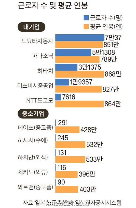 이미 일부 연구조사에서는 영세기업의 연봉이 중견기업에 육박하는 것으로 나타난다. 도쿄노동상담정보센터의 조사에 따르면 도내 10~49명의 근로자가 일하는 사업체의 평균 월급은 33만6925엔(7월 기준)으로 50~99명 36만3167엔, 100~299명 34만743엔과 큰 차이가 없었다.