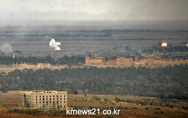 시리아 정부군이 팔미라 고대 도시를 탈환하기 위해 IS와 전투를 벌이고 있는 지역에서 연기가 올라오고 있다.
