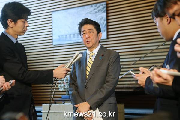 ▲ 도널드 트럼프 미국 대통령과 7일 전화 통화 후 기자회견을 하고 있는 아베 신조 일본 총리. JIJI PRESS / AFP[제공자ⓒ 뉴스21통신. 무단전재-재배포 금지.]도널드 트럼프 미국 대통령과 아베 신조 일본 총리가 북한의 위협이 도전적인 미사일 시험에 이어 "새로운 단계에 접어 들었다"고 경고했다.