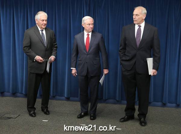 ▲ 도널드 트럼프 미국 대통령이 6일(현지시간) `반(反)이민 수정 행정명령`에 서명한 가운데 (왼쪽부터) 렉스 틸러슨 국무장관, 제프 세션스 법무장관, 존 켈리 국토안보장관이 워싱턴DC에서 공동 기자회견장에 도착하고 있다.MARK WILSON / GETTY IMAGES NORTH AMERICA / AFP[제공자ⓒ 뉴스21통신. 무단전재-재배포 금지.]도널드 트럼프 미국 대통령이 6일(현지시간) 기존 입국금지 대상 이슬람권 7개국 중에서 이라크를 제외하고 나머지 6개국 국적자의 입국을 일시적으로 제한하는 반(反)이민 수정 행정명령에 서명했다.