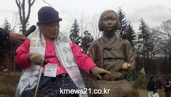 휠체어에 의지한 안 할머니는 소녀상 옆 빈 의자를 자신이 채우고는 옆에 있는 '소녀'를 어루만졌다. 그러고는 "여러분의 힘으로 이런 행사가 마련됐다"라며 감격스러워 했다.
