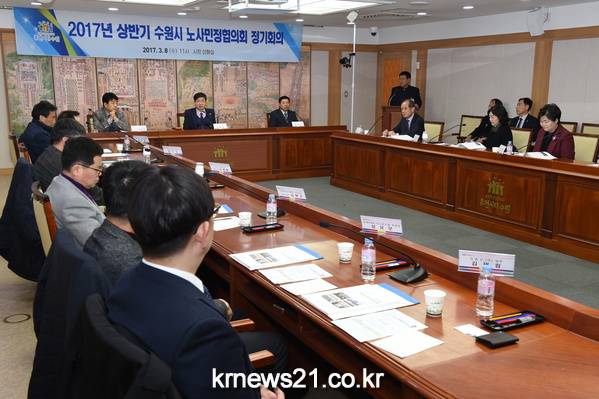 수원시 노사민정 협의회는 8일 수원시청에서 정기회의를 열고 ‘노사민정 협업체계 강화와 사회적 책임 준수’, ‘청년 일자리 창출과 고용복지네트워크 운영’, ‘취약근로계층의 사회안전망 구축과 일·가정 양립’ 등 2017년 고용노동현안 의제를 선정했다.