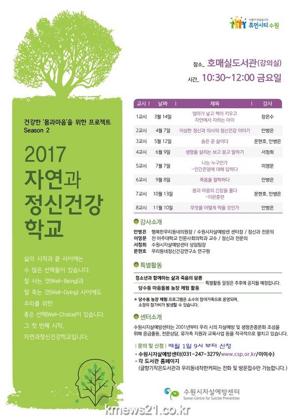 수원시자살예방센터 주관으로 14일부터 11월까지 매달 한 차례 ‘자연과 정신건강학교’를 연다. 엄마가 낳고 책이 키우고 자연에서 자라는 아이, 이상한 정신과 의사의 정신건강 이야기, 죽음을 철학하다, 무엇을 어떻게 먹을 것인가 등 8가지 주제의 강의가 진행된다.