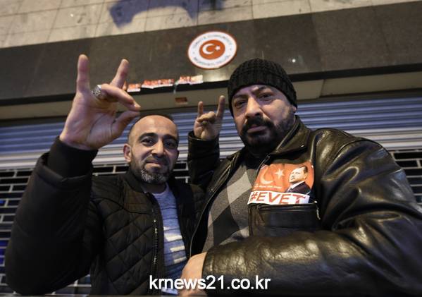 ▲ 3월 12일(현지시간) 네덜란드 로테르담 주재 터키 영사관 앞에 서 있는 레제프 타이이프 에르도안 터키 대통령 지지자들JOHN THYS / AFP[제공자ⓒ 뉴스21통신. 무단전재-재배포 금지.]개헌 국민 투표를 지지를 위해 터키 각료들이 유럽국가에서 집회를 여는 것에 유럽연합(EU) 국가들이 이를 불허하거나 터키 각료의 입국 금지 조치를 취하면서 터키와 EU국들의 관계가 악화되고 있다.