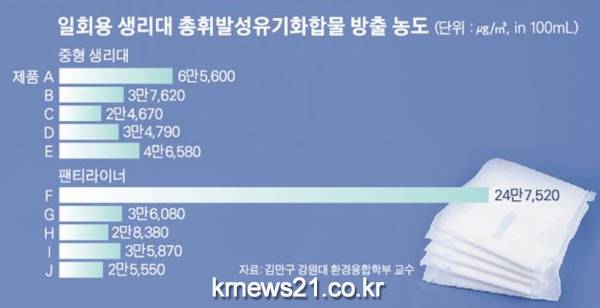 김 교수는 “우리가 숨 쉬는 공간인 다중이용시설 실내 관리 총휘발성유기화합물 기준(500㎍/㎥ 이하)과 비교하면 수십 배 이상 높은 농도에 장시간 노출되고 있는 셈인데, 500배 가까이 높은 제품도 있었다”며 “생리대와 피부 사이의 공간이 좁은 만큼 더 진한 농도에 노출될 수 밖에 없다”고 지적했다.
