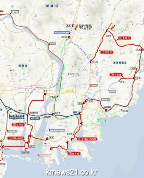 부산 시내 전역에 도시철도망이 촘촘하게 구축된다. 부산시는 중·장기적으로 시내 전역에 7개 노선, 총연장 82㎞의 도시철도를 신설하는 방안을 적극 추진한다고 22일 밝혔다.
