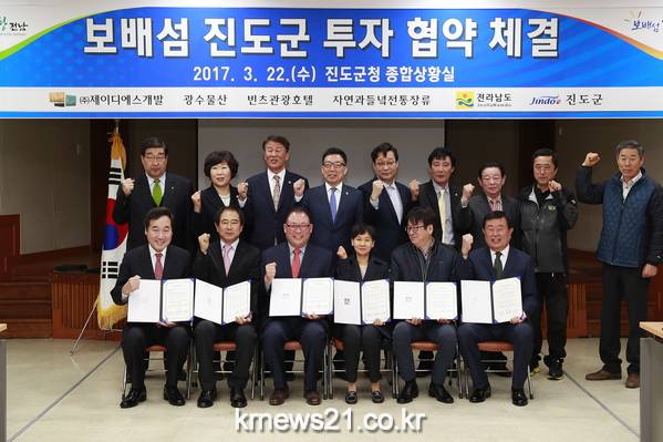 22일 진도군에 따르면 진도군청 종합상황실에서 열린 이날 협약식에는 조득상 ㈜제이디에스개발 대표이사, 한광수 광수물산 대표이사, 김보수 빈츠관광호텔 대표이사, 김영이 자연과들녘 전통장류 대표이사, 이낙연 전라남도지사, 이동진 진도군수, 진도군민 등이 참석했다고 밝혔다.