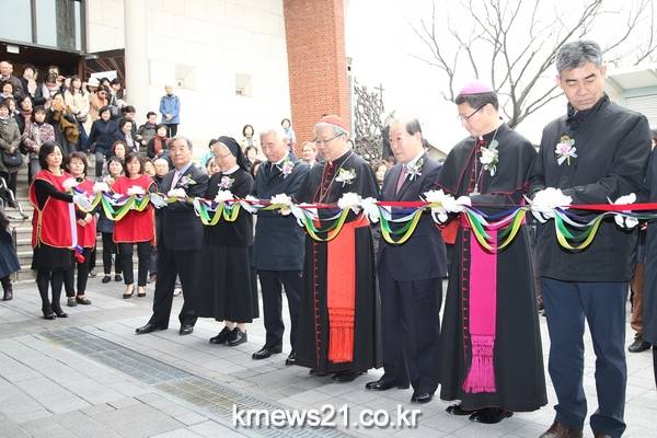[사진 1] : 3월 25일 오전, 박홍섭 마포구청장(우측 세번째)이 2017 절두산순교성지 축성 봉헌50주년 수집유물 특별전 개막식에 참석해 염수정 추기경(우측 네번째)및 관계자들과 함께 테이프 커팅식을 하고 있다.