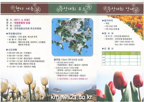 ‘아름다운 해안선에 산과 섬, 튤립과 함께’라는 주제로 개최하는 이번 등산대회는 신안군 튤립축제 기간(4.7~4.16) 중에 열려 즐거운 산행과 다양한 볼거리와 즐길거리를 경험할 수 있다