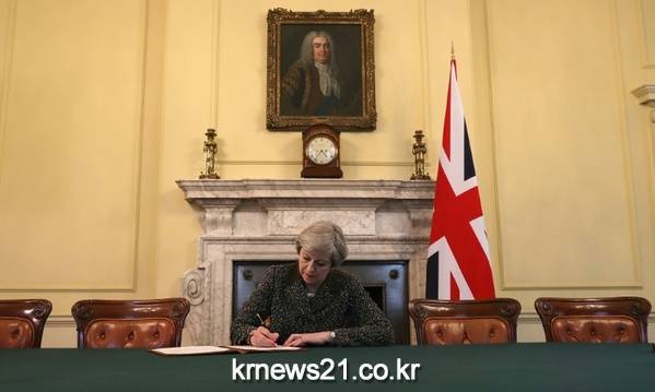 ▲ 28일(현지시간) 통보문에 서명하는 테리사 메이 영국 총리 CHRISTOPHER FURLONG / POOL / AFP [제공자ⓒ 뉴스21통신. 무단전재-재배포 금지.]테레사 메이 영국 총리가 28일(현지시간) 브렉시트(영국의 유럽연합(EU) 탈퇴) 개시 서한에 서명했다.