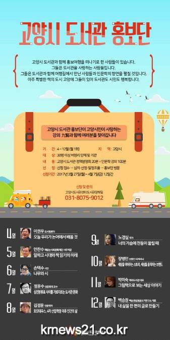 ‘찾아가는 고양시 도서관 홍보단’은 이권우 도서평론가를 비롯해 안찬수(책읽는 사회문화재단 사무처장), 손택수(시인), 정윤수(성공회대 교수), 김경윤(인문학자), 노경실·백승권(작가), 장병인(브랜드 디자이너), 박미숙(책과도서관 대표) 총 9인으로 결성됐다.