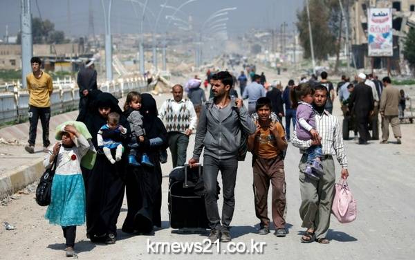 ▲ AFP / AHMAD GHARABLI[제공자ⓒ 뉴스21통신. 무단전재-재배포 금지.]이라크 모술 구시가지에서 IS와 이라크 정부군의 계속 되는 전투로 인해 마을을 떠나고 있는 사람들.