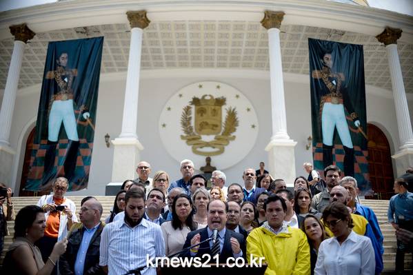 ▲ 훌리오 보르헤스 베네수엘라 국회의장이 의회 앞에서 30일(현지시간) 의회의 입법권을 대법원이 대행토록 하는 판결에 항의하는 기자회견을 하고 있다. FEDERICO PARRA / AFP[제공자ⓒ 뉴스21통신. 무단전재-재배포 금지.]베네수엘라 대법원이 30일(현지시간) 우파 야권이 장악한 의회의 입법권한을 대법원이 대행토록 하는 판결을 내렸다.