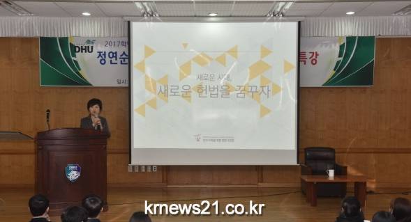 대구한의대학교(총장 변창훈) 기초교양대학은 30일 오후 바이오센터 강당에서 재학생 200여 명이 참석한 가운데 민주사회를 위한 변호사 모임 정연순 회장을 초청해 '새로운 헌법을 꿈꿔보자'라는 주제로 특강을 실시했다.