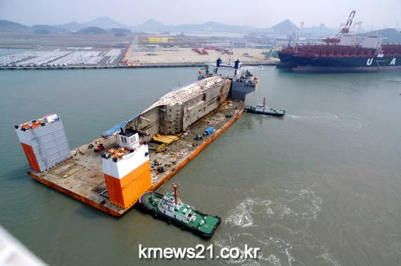김창준 세월호 선체조사위원장은 1일 오전 목포신항만 앞에서 기자들과 만나 "오는 6일 세월호를 육상에 거치한다. 전날 모듈 트랜스포터로 세월호를 운반하는 테스트를 한다. 4월4일 자정이 펄 제거 시한이다"고 말했다.