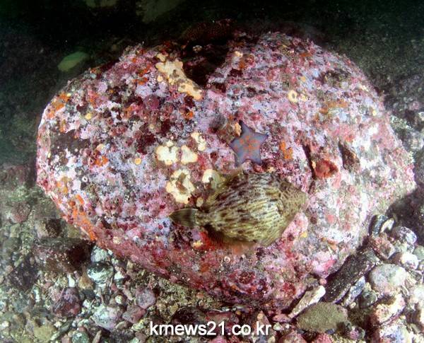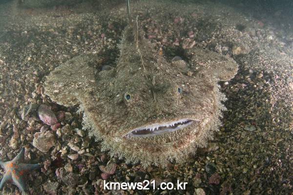 삼천포 앞 바다에서 은밀하게 숨어서 사냥감을 기다리는 아귀 모습 이다.
