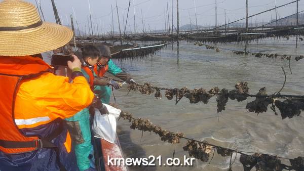 이번에 수확한 참굴은 기존 김양식장 지주항목 하부에 굴 채묘연(단련굴)을 수평으로 연결하여 1년동안 성장(각장 8~9cm)한 것으로, 중간 성과분석 등을 위해 시설량(1,200m)의 30%을 수확하였으며, 나머지는 오는 12월에 수확할 예정이다.